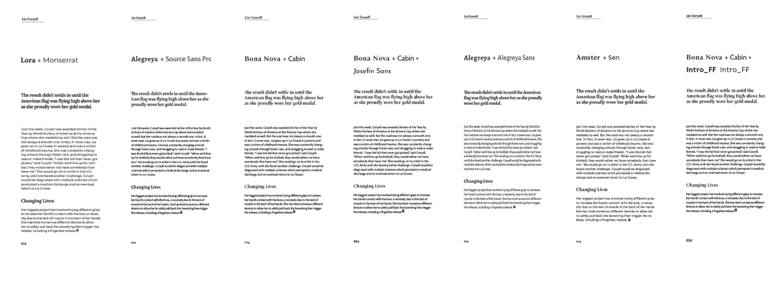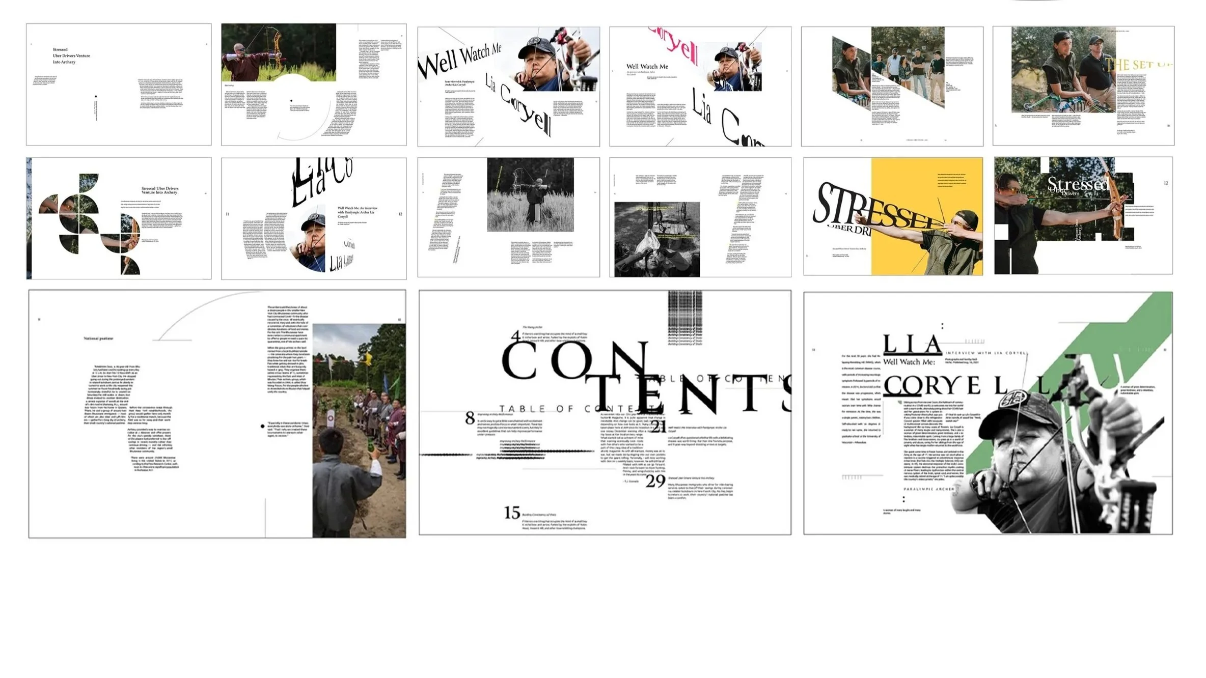 Archery is all about having the right angle. At the start of these experiments, I focused on how to show those angles, but ultimately, I found success in portraying the tension, motion, and strength through various typesetting across spreads.